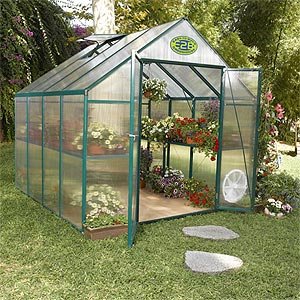EasyGROW greenhouses are the perfect solution for the home gardening enthusiast looking for a smaller greenhouse with superior polycarbonate paneling and professional style ventilation and doors. These unique greenhouses come complete with two built-in benches that run the full length on each side of the greenhouse. Easy Grow greenhouses also come with an insulated 4mm/.15 inch twin wall polycarbonate covering and easy to install aluminum frame with patented "Push & Click" connectors. Enjoy the light diffusion and beauty that polycarbonate affords without the fear of breakage and drastic temperature changes experienced in glass greenhouses. The beautiful powder coated forest green aluminum frame on the Easy Grow will fit in perfectly with your outdoor home garden atmosphere.